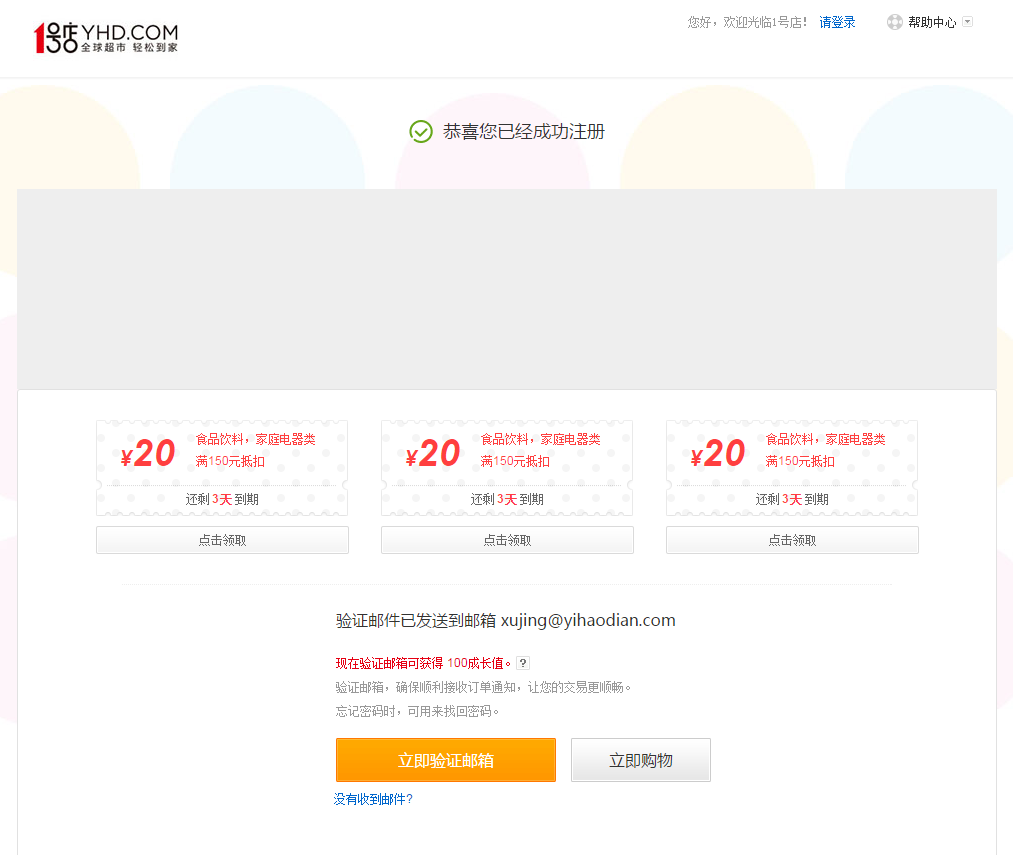 4.登陆到您的个人邮箱,找到标题为"恭喜你加入1号店"的邮件,打开后点击"验证邮箱" 即可